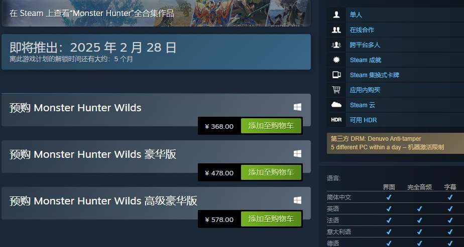 怪物猎人荒野预购奖励是什么?目前游戏的预购已经在steam平台开启了,游戏的版本、售价以及预购奖励都已经正式公布。下面为大家介绍一下怪物猎人荒野预购奖励以及领取方式,想要了解的玩家就一起来看看吧。