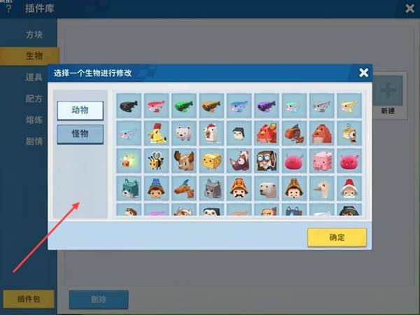 2、进入修改页面,你可以选择动物或者怪物,它们会成为商人。