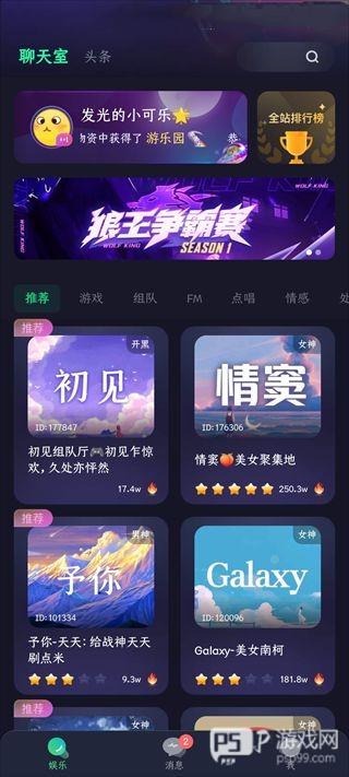 2、进入软件后默认为娱乐界面,在此为用户推荐了一些有意思的直播,其中有各种不同的板块,比如说游戏、组队、点唱等等。