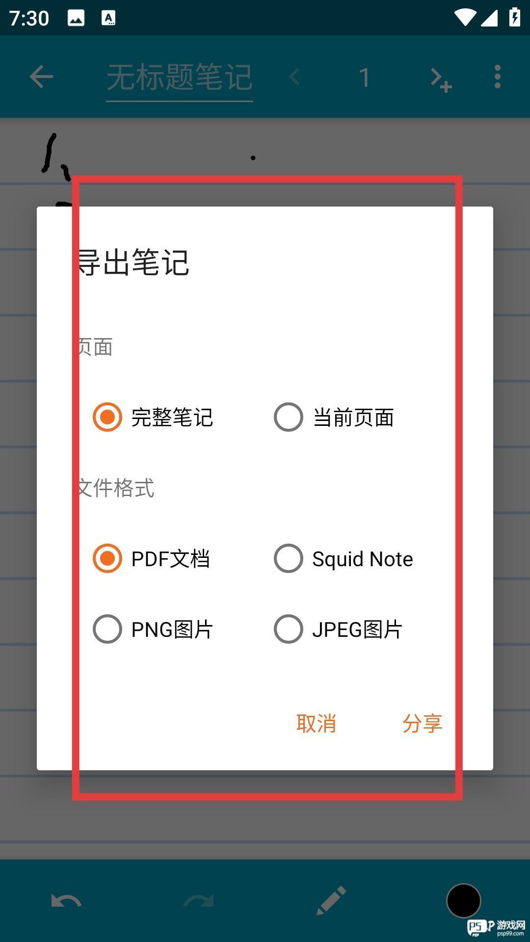 3、在导出笔记页面选择要导出的页面范围以及文件格式,选择好参数后点击分享按钮,根据提示选择保存位置或分享方式,即可完成笔记的导出。
