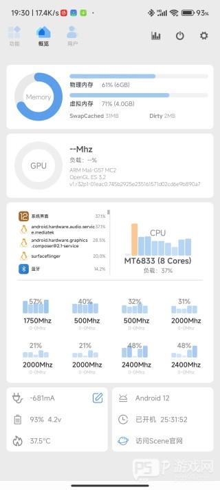 进入首页,我们可以很直观的查看到各种手机数据,可以看到我们手机的内存使用情况、系统进程、CPU占用、各个核心情况等等等等