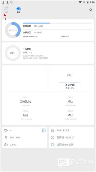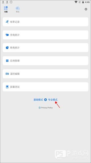 3、在这里显示了帧率记录、充电统计、耗电统计等功能,你可以点击下方红色箭头指向的地方来重新选择工作模式。