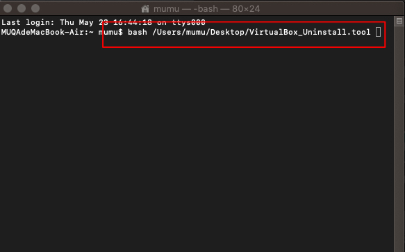 第三步,在「终端」命令行中输入bash,按空格键后将桌面VirtualBox_Uninstall.tool拖到命令行中并按回车键,如下图