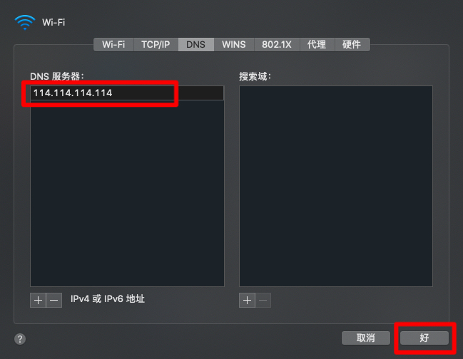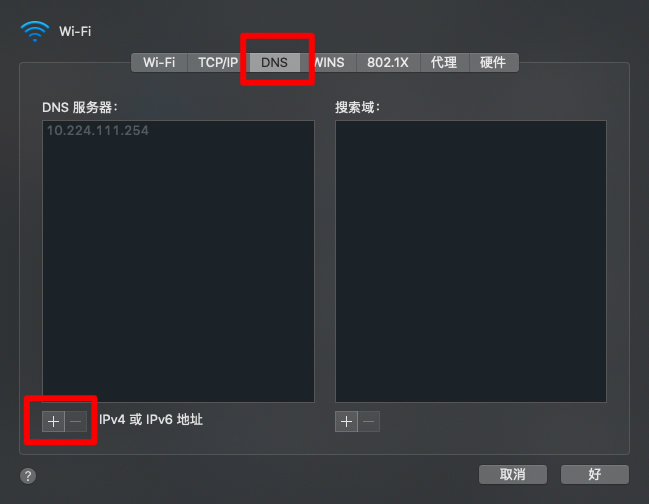 1)点击打开系统偏好设置--网络--点击高级-dns--添加地址;