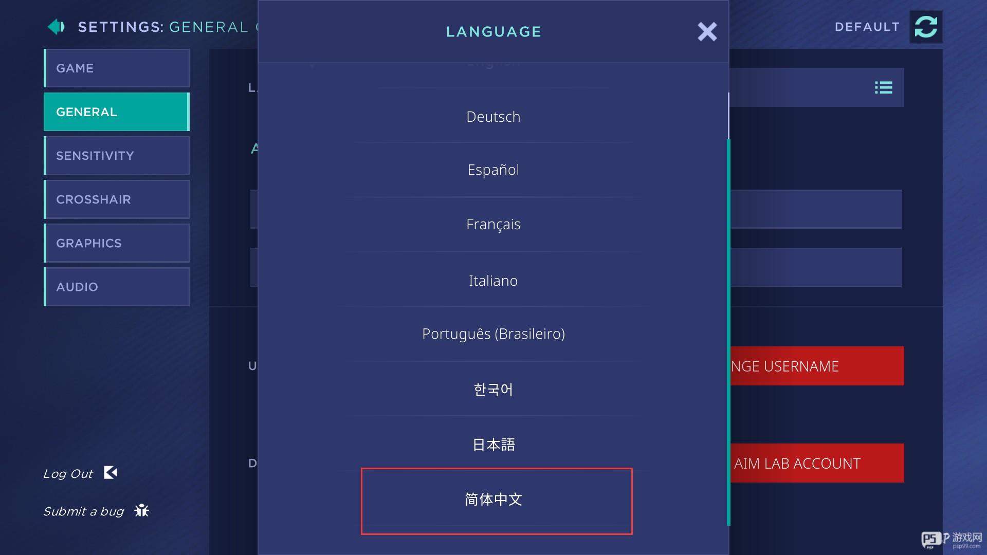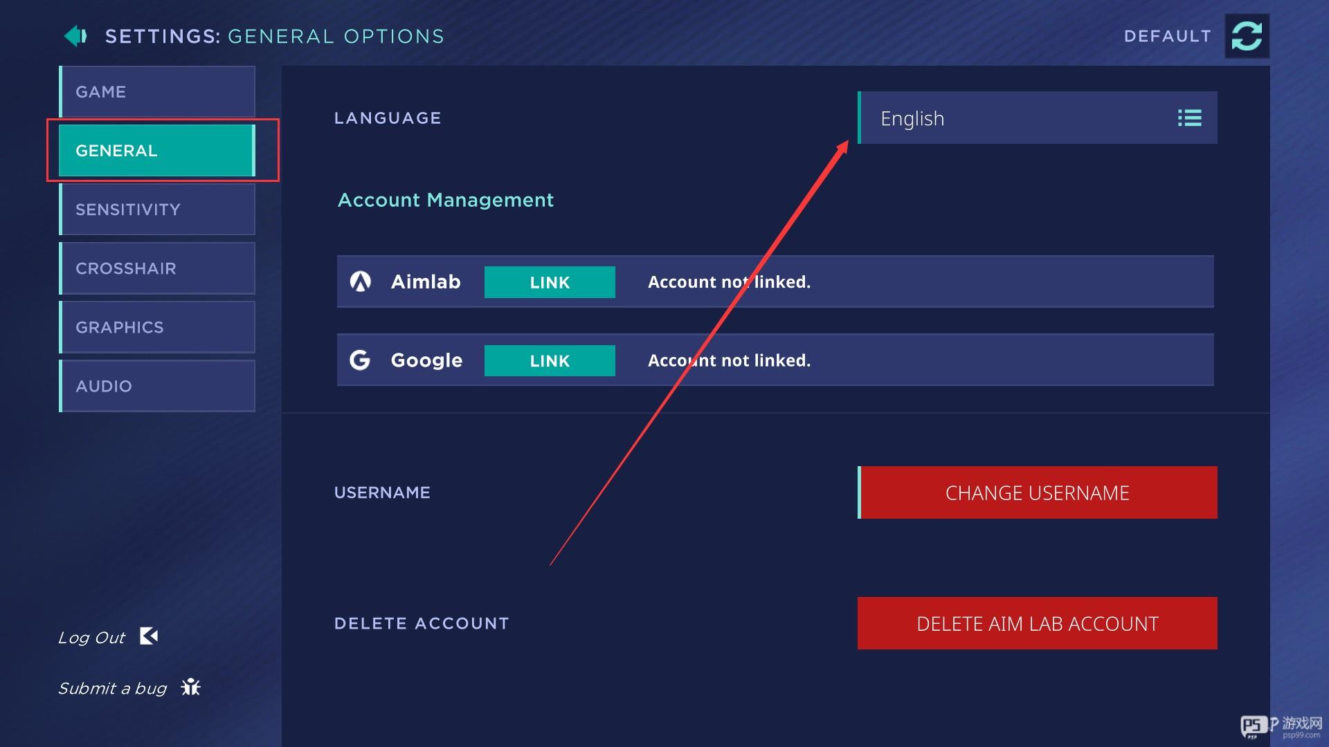 4、点击左侧的GENERAL栏目后点击右侧语言选项栏