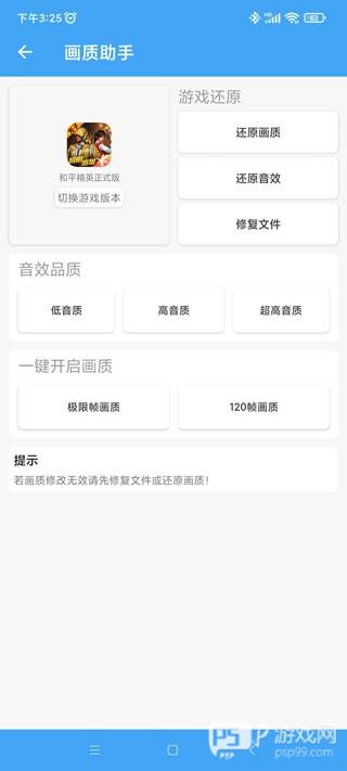 1、在本站下载安装唯梦工具箱后运行软件。点开画质助手,能支持修改和平精英的画质、音效等等,还可以开启120帧和极限帧画质;