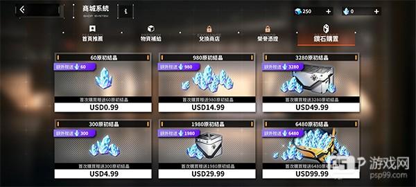 付费单位为美元,从0.99刀到99.99刀,所有等级首次充值时都额外赠送等值的“原初结晶”。