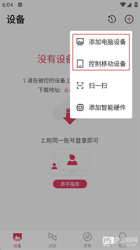 2、在弹出的功能列表中根据需求选择添加电脑设备或控制移动设备;