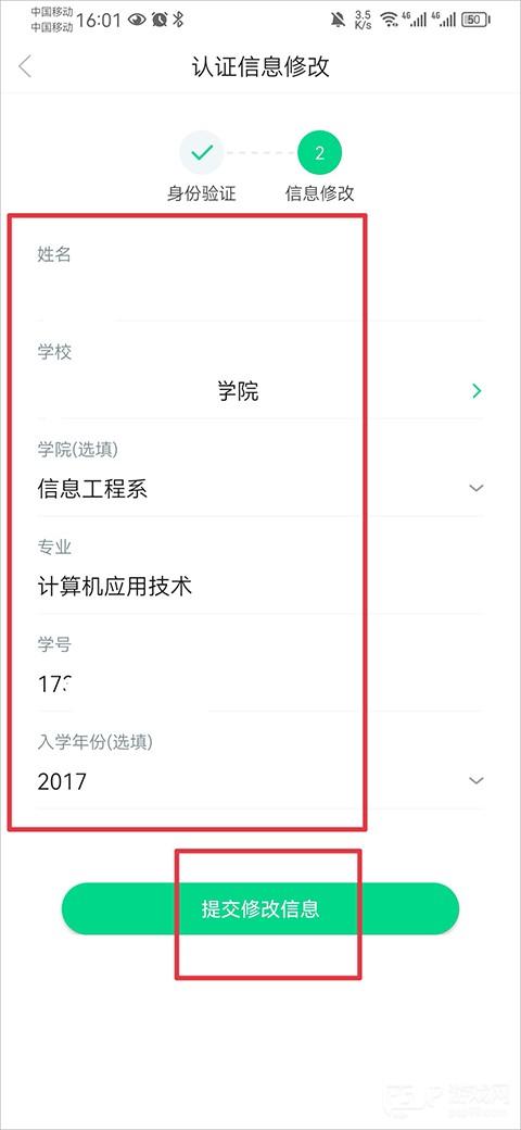 最后将正确的学校名称、学号等信息完善后点击提交修改信息即可