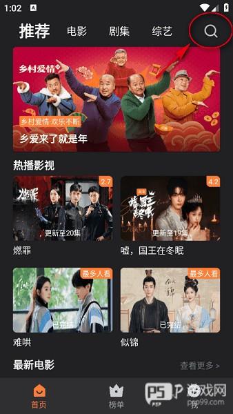 2、登录成功以后,返回“首页”,点击右上角的放大镜图标,可以搜索影片;