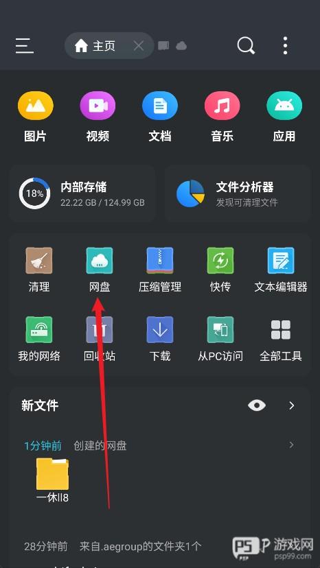1、打开ES文件浏览器,点击首页的“网盘”功能。