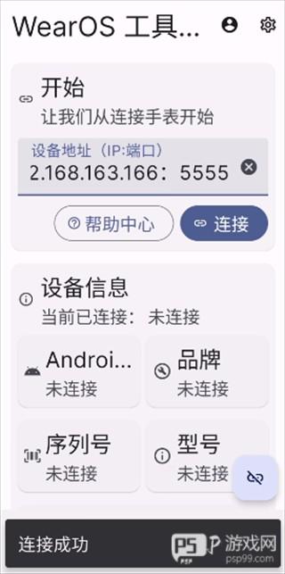4、我们需要在手机上下载wearos工具箱,将上一步显示的IP输入至设备地址栏里,然后点击连接,等待显示连接成功。