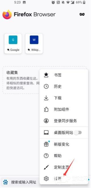 1、打开火狐浏览器,点击右上角三个点的菜单按钮,在弹出菜单中选择设置。