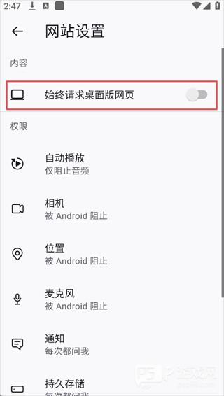 3、找到始终请求桌面版网页选项,打开右侧开关即可。