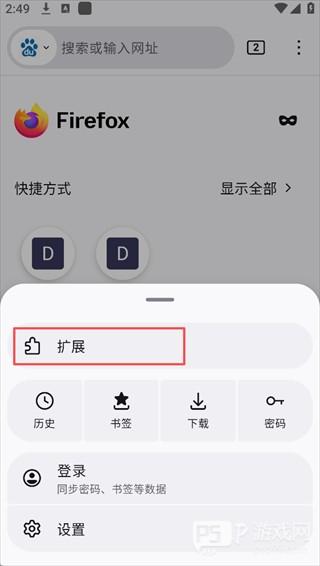 1、打开火狐浏览器,点击右上角三个点的菜单按钮,在弹出菜单中选择扩展。