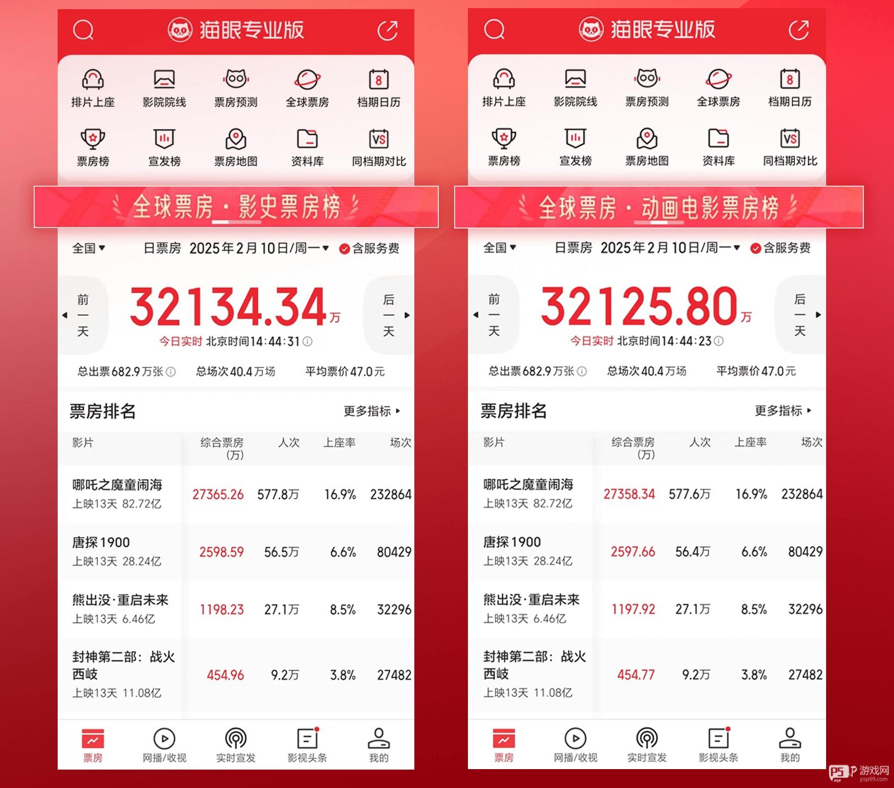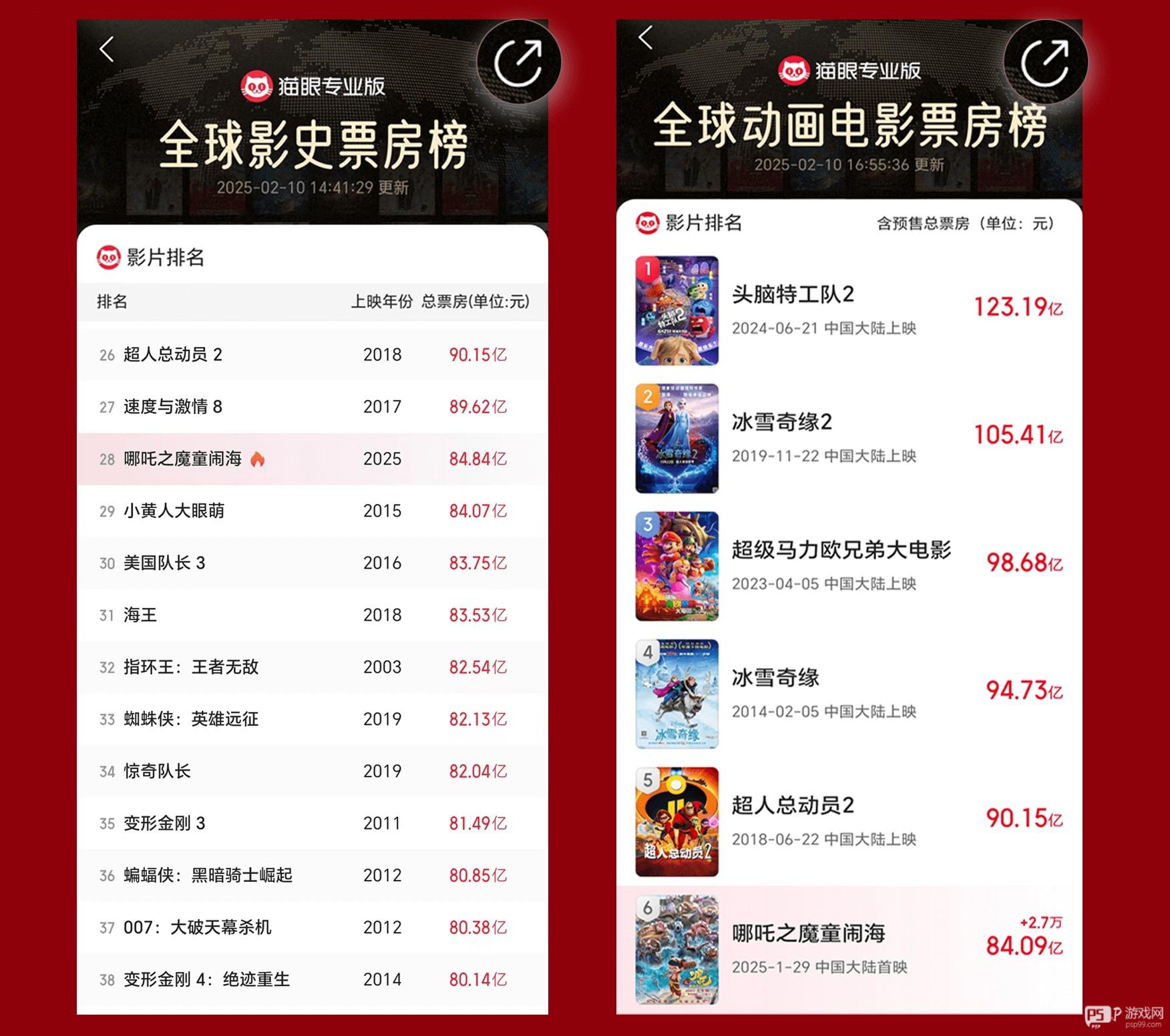 实时获取全球影史票房榜、全球动画电影票房榜排名信息