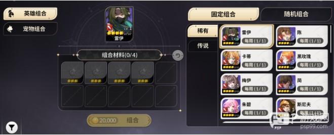 主界面左下角—工坊—组合—英雄组合可以点开如图所示界面,可以使用四个三星狗粮来兑换一个四星稀有角色,最好全部兑换,强力的稀有角色用于自行突破,较弱的四星稀有角色用于给五星角色强化当狗粮,可以极大地节省三星狗粮。
