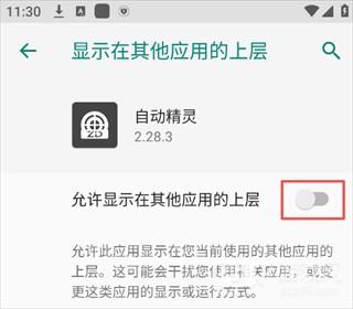 2、在系统权限设置页,开启「允许显示在其他应用的上层」开关,授予自动精灵免费脚本App悬浮窗权限,保障脚本正常运行。