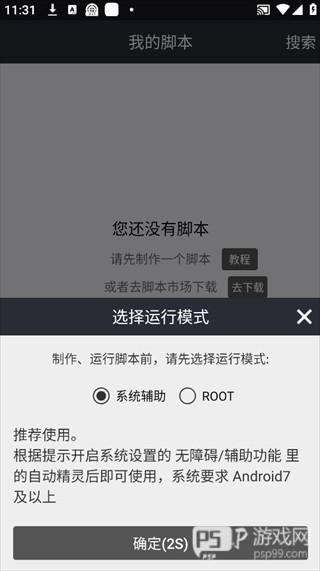 4、在「选择运行模式」弹窗中,默认选择推荐的「系统辅助」模式,等待2秒后点击「确定」,无需ROOT即可使用。