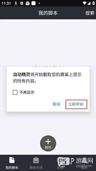 3、在弹出的屏幕截取授权弹窗中,点击「立即开始」,允许自动精灵免费脚本App获取屏幕内容,完成录制前的授权。