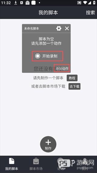 1、进入脚本编辑,可选择「开始录制」自动记录操作,也可点击「添加动作」手动编辑脚本步骤。
