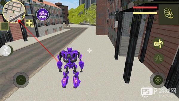 3、点击右侧这个按钮,英雄人物就可以直接变身成为一辆汽车开始跑酷追击敌人,再点击一下就可以变身机器人展开战斗。