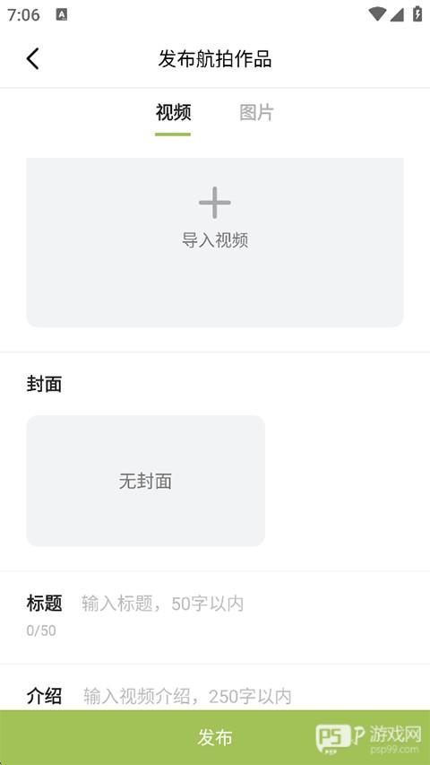 3、上传你拍摄的航拍作品、封面以及填写标题介绍等,完成后点击发布;