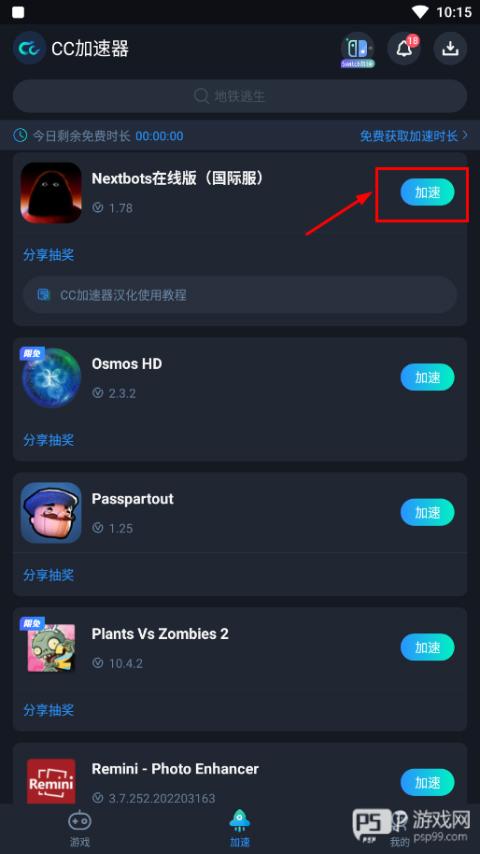 1、首先打开CC加速器,找到Nextbots联机版,点击右侧加速;