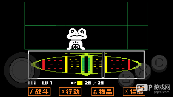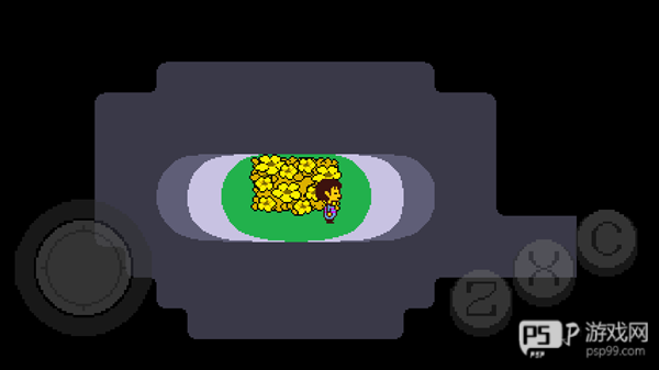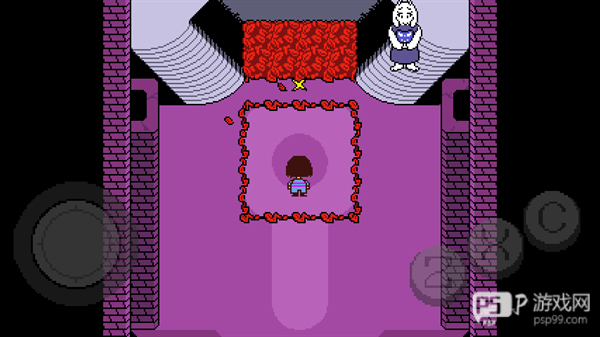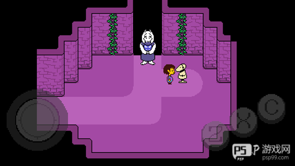 4、去到北面的藤蔓房间内会遇到青蛙froggit,选择“行动——赞美”,虽然青蛙不知道你在说什么,但他变得很开心,他就会逃离战斗。在右面的水池上有一个尖刺陷阱,Toriel会牵着你的手通过这个陷阱区域。