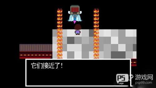 这时候你被迫走上了那个脸papyrus都记不清步骤的色板上,你是肯定走不出去的,所以站在原地等待两边的火墙靠近即可,alphys博士会在紧急情况下将它们关停。