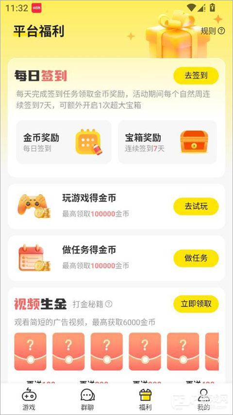 4、进入福利中心,每天完成签到任务领取金币奖励,金币可用来兑换Y币。