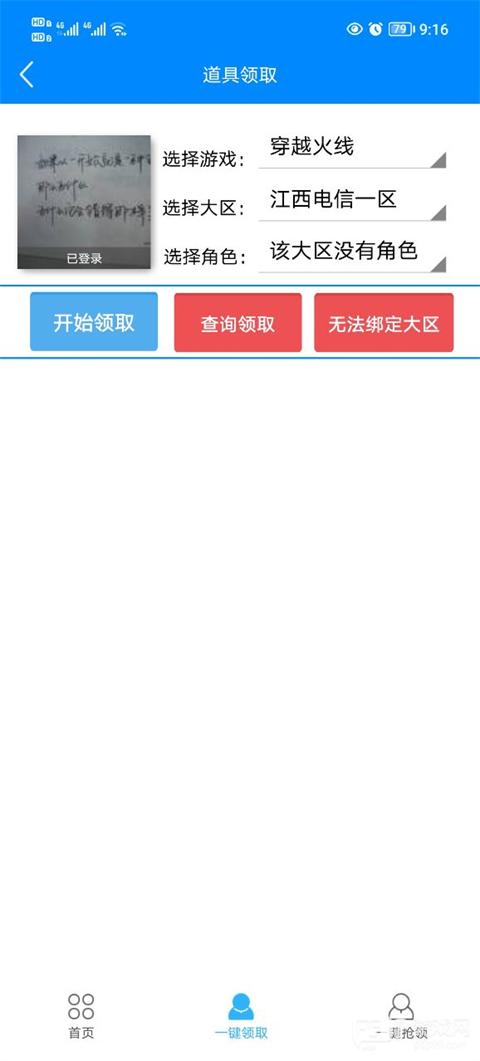 2、登录完成之后选择大区和角色信息之后点击开始领取。