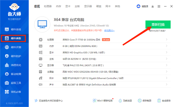 3、进入【硬件参数界面】,用户在这里可了解当前电脑的处理器、内存、显卡、主板等相关的信息参数,选择【重新扫描】可进行检测,