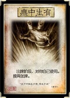 【无中生有】算是所以锦囊牌中最爽的,毕竟可以摸2张牌,相当于多了一个摸牌阶段。俗话说,牌不是万能的,但是没牌却是万万不能的。有卡牌才有输出,所以敌人使用【无中生有】时一定要【无懈可击】。毕竟在游戏后期,一张合适的卡牌就能扭转战局,所以要务必让敌人少牌。在实战中,【无中生有】经常被【无懈可击】化解,所以敌人都会用其他锦囊牌骗【无懈可击】。