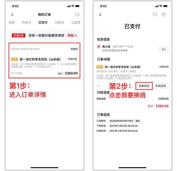 1、打开高途,点击「我的>我的订单」,选择需要调班的订单,进入相应的订单详情,点击【我要换班】按钮。