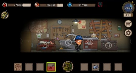 3、点击僵尸就能自动攻击,玩家在前期只能靠木棍、小刀等破烂来杀敌,随着工作台的升级,他能制作出越来越强大的枪械,装备手榴弹、燃烧瓶等辅助武器,饮食方面,则要用到灶台来制作食物。