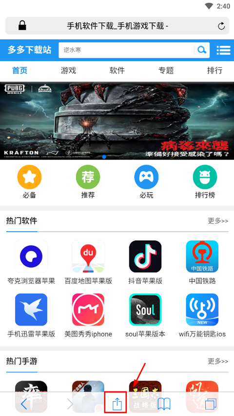 1、打开safari,然后打开一个网页,点击下方向上箭头按钮;