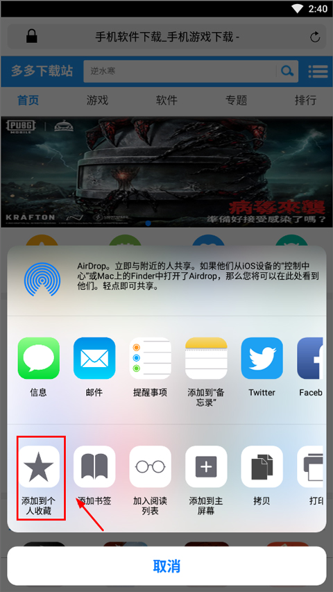 2、在弹出的工具选项中,点击【添加到个人收藏】;