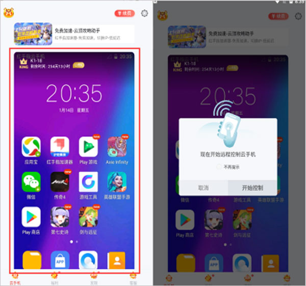 1、点击云手机预览界面,弹出远程控制云手机提示,点击开始控制进入虚拟云手机桌面。