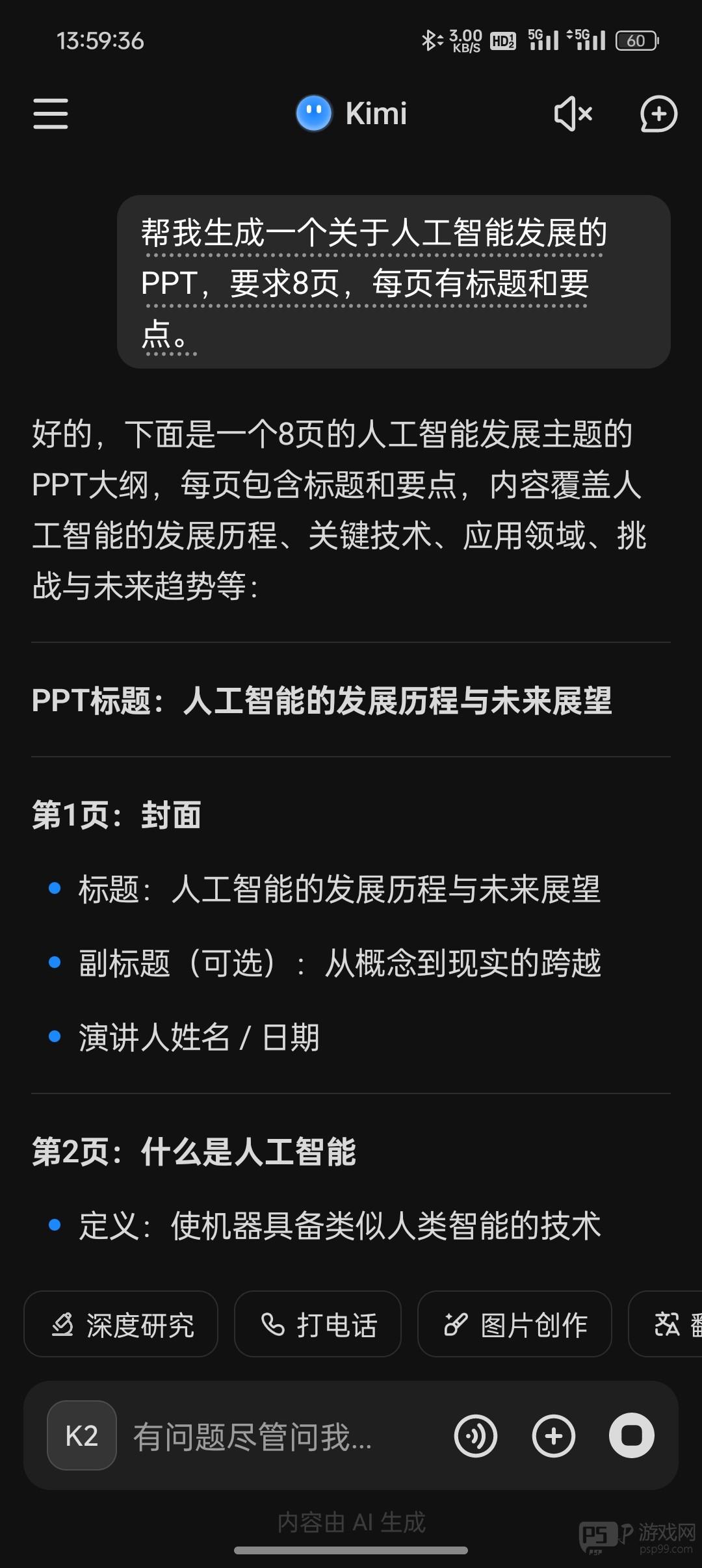 你只需要输入指令,比如:帮我生成一个关于人工智能发展的PPT,要求8页,每页有标题和要点。