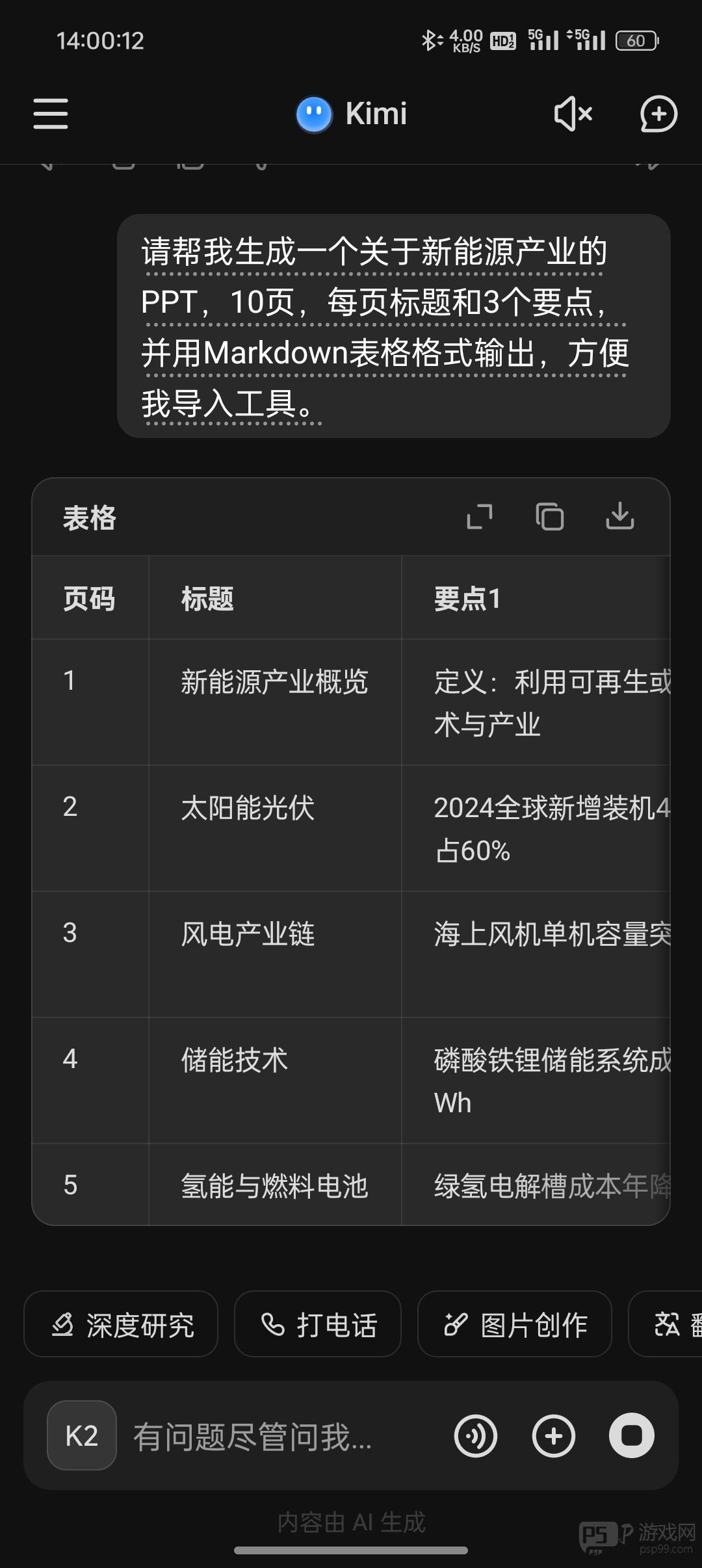比如输入:请帮我生成一个关于新能源产业的PPT,10页,每页标题和3个要点,并用Markdown表格格式输出,方便我导入工具。