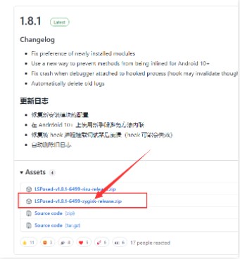 5、在GitHUb 上的 LSPosed 仓库中,下载箭头所指的 LSPosed-Zygisk 版的模块;随后在Magisk框架中选择【本地安装】,安装下载到的 LSPosed 模块。