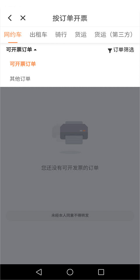 3、在打开的【开具发票】页面中,选择相关服务类型的发票务(顺风车服务不开具发票),这里以网约车为例