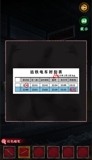 3、等待电车到来后,玩家们会发现电车的大门被锁了起来,玩家们退回候车厅,找到电车的时刻表,根据数字和图案的形状得知锁的密码;