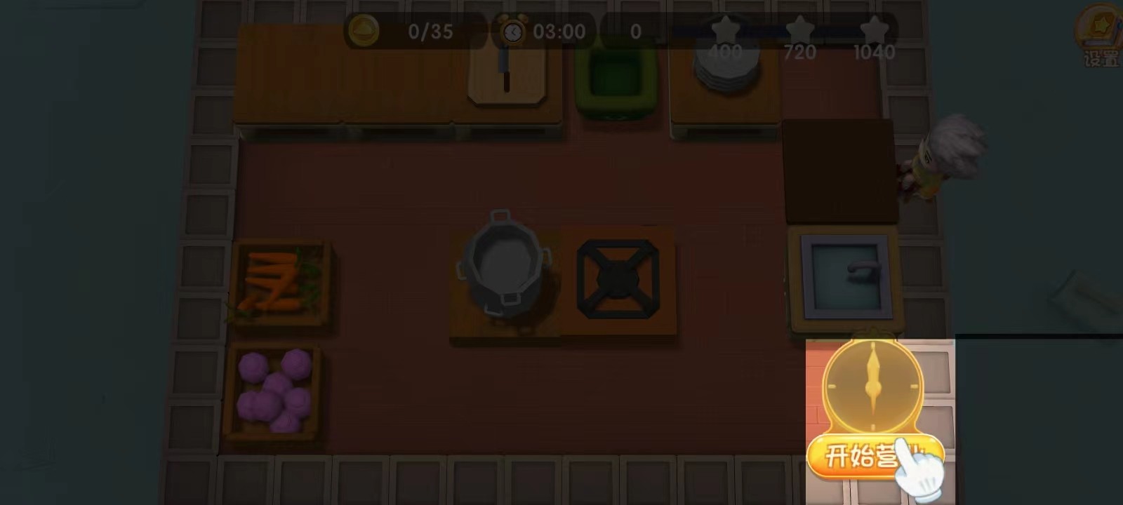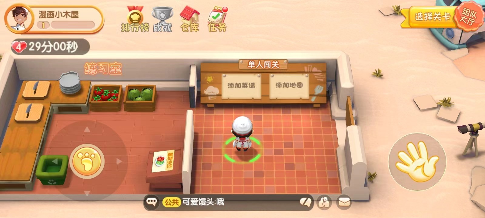 3、教程结束以后就正式进入游戏了,这里是你的秘密后厨,不仅可以练习做菜还可以出发创业;