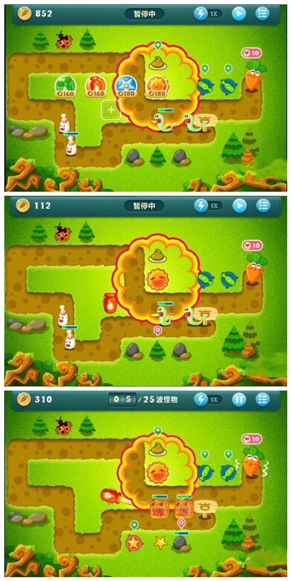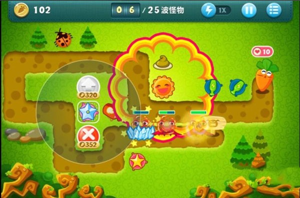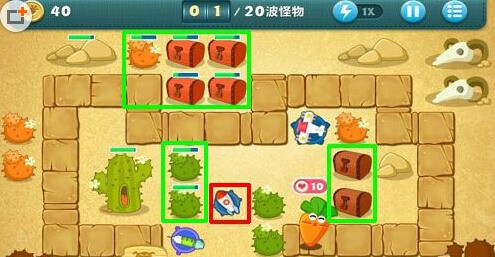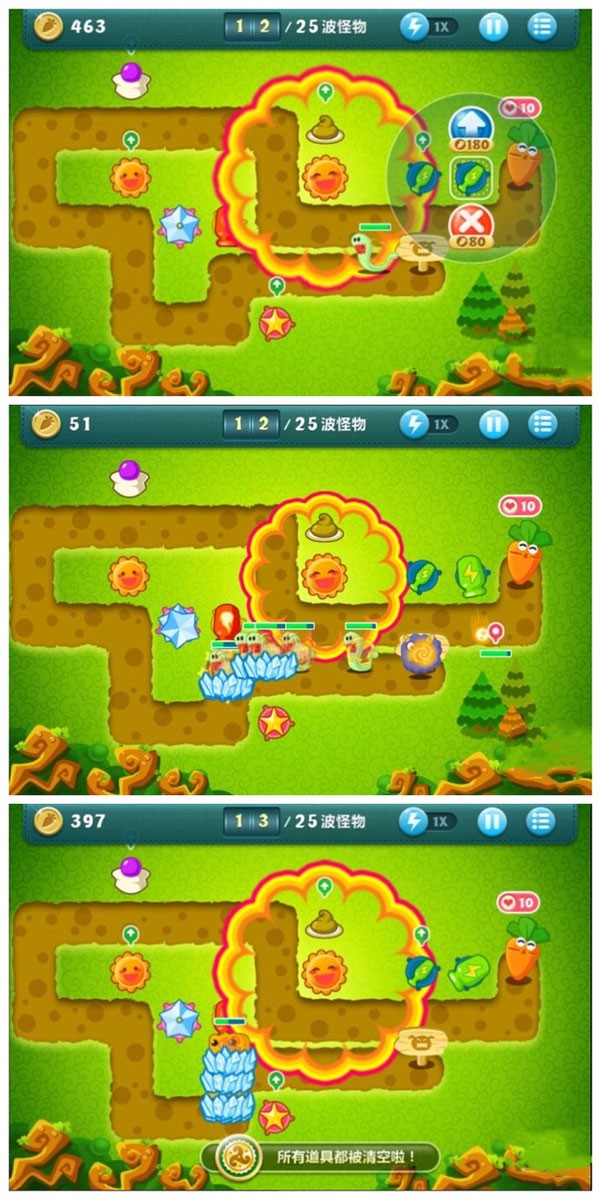 2、如图所示,太阳炮塔周边的道具摧毁后,会得到1个便便、2个瓶子炮塔,先不用升级,太阳炮塔全力攻击风车道具,怪物进入太阳炮塔攻击范围内时,自然会被消灭。