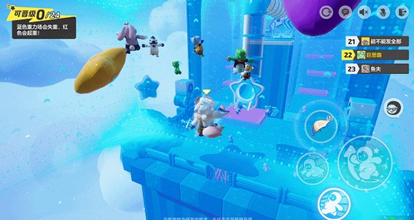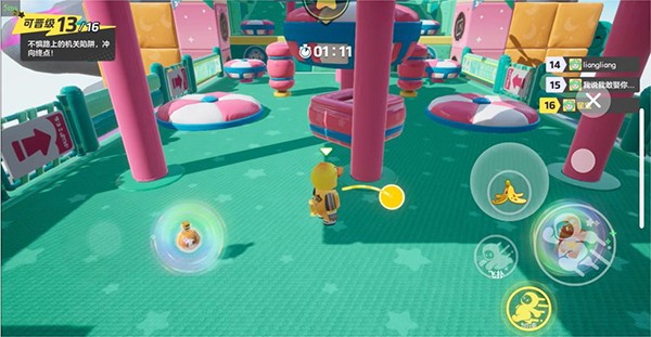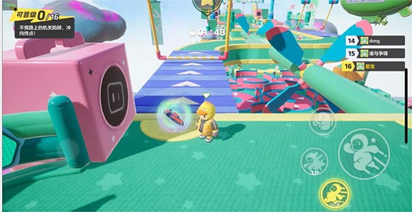 进入游戏,操作方面可以说跟蛋仔没什么差别,左边轮盘控制移动,右边分别为加速、飞扑、跳跃和道具使用。