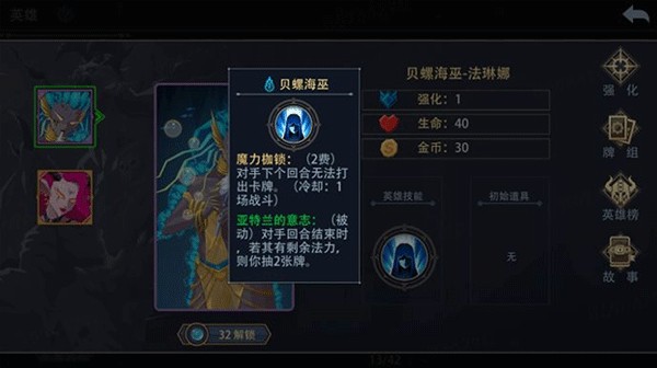 -紫色史诗英雄,其主动技能【魔力枷锁】拥有全游戏最强力的效果——对手下回合无法打出卡牌。在关键回合使用主动技能其效果不亚于打出了一张9费的时光吞噬(跳过对手下一回合)