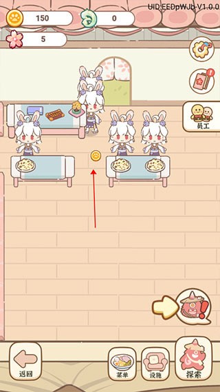 2、客人点餐后厨房自动做菜、上菜,点击地上的金币就可以获得费用,前期可以点击右下角的妖怪图标,按照任务列表解锁新摆设。