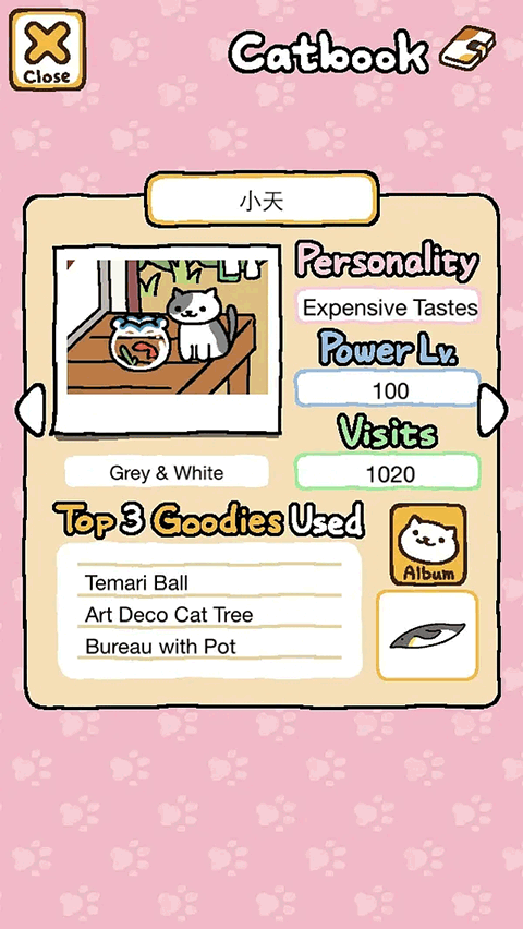 然后就是personality、power、visits,Personality就是字面意思对这只猫咪的性格进行描述,这一点也可以帮助你给猫咪起一个更适合他的名字。Power代表着他的活力值,活力值越高越容易抢到他最喜欢的玩具,活力值低于他的猫就只能玩别的玩具。Visits代表他的造访次数,一般造访过50次左右就会给你小礼物了,但是也不一定。